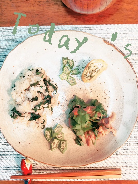 『緑の食卓』より /Noriko.T〇梅と大葉のチャーハン:ごま油で炒めます・・〇パセリをちらした卵焼き〇豚肉とパクチーのみそ炒め ・・豚肉と炒めると、パクチーの香りがひきたちます☆〇ほかのメニューがしっかり味なので オクラは何もつけずそのままで美味しい!〇大根とわかめのお味噌汁野菜の香りに夏バテを助けてもらう食卓( *´艸`)NORIKO☆TAKAYAMA