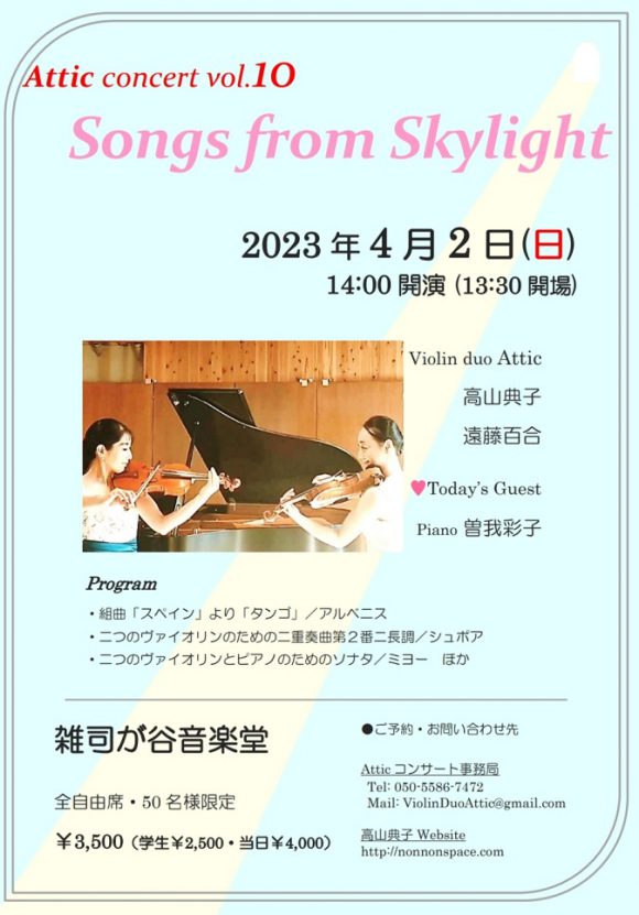 Attic春公演の受付をスタートしました☆早々のご予約をいただきありがとうございます。陽ざしもこれから日に日に明るくなってゆくでしょう。本番までじっくり準備を重ねていきたいと思います。NORIKO☆TAKAYAMA