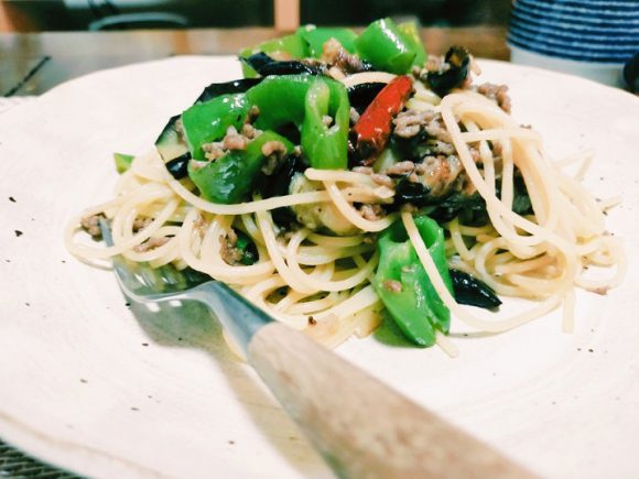 ↑ ししとう・ナス・ひき肉のパスタNORIKO☆TAKAYAMA